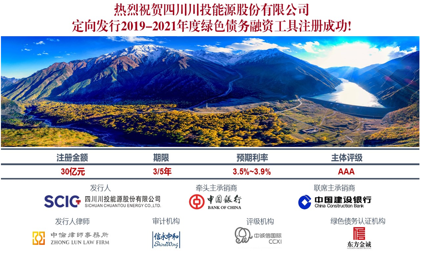 2月18日,川投能源迎來“定向發行2019-2021年度綠色債務融資工具”注冊成功的好消息。本次私募債注冊金額30億元,公司可在注冊額度內分批次或一次性發行,募集資金將定向用于公司投資的綠色項目建設,期限3/5年。此次為川投能源首次成功注冊私募債綠色債務融資工具,牽頭主承銷商為中國銀行。私募債發行利率將根據發行時的市場情況確定,預期在3.5%-3.9%之間(3-5年期限),遠低于同期限銀行貸款基準利率。