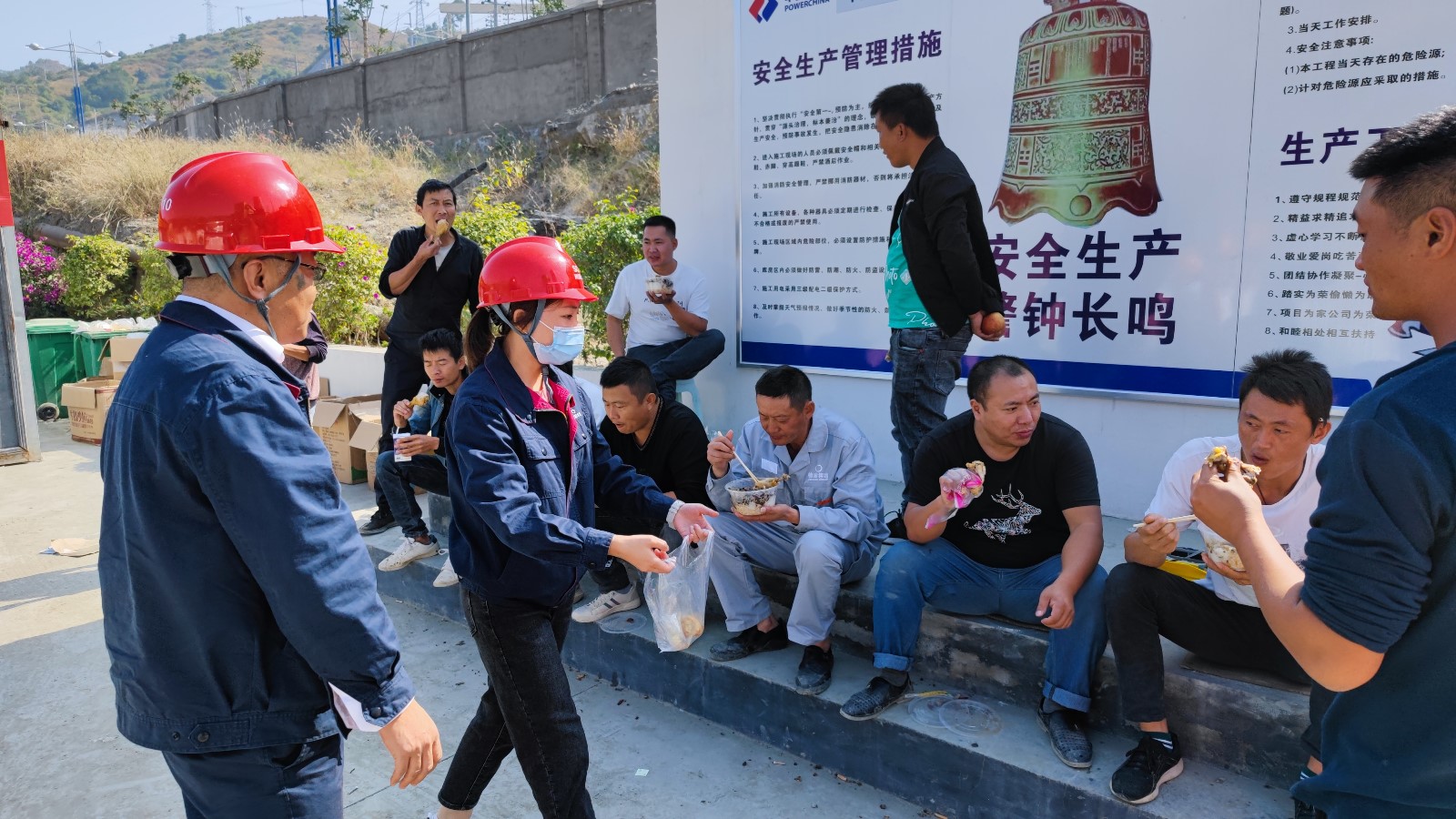 通過近日對施工班組的了解,為確保大江截流的目標按期實現,工人們中午、晚上用餐都是送到施工現場簡單解決,11月9日,機關第一黨支部組織了以“工人在加班,我為工人送加餐”的主題黨日活動,組織支部黨員、預備黨員、入黨積極分子、志愿服務者共15人到導流明渠施工現場,慰問在施工現場加班加點的一線工人,為他們送去了雞腿、蘋果等慰問品。