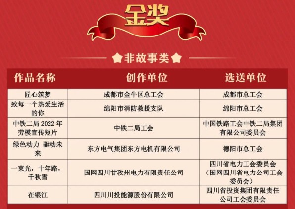 在熱烈慶祝黨的二十大勝利召開之際,由四川省總工會主辦的本次大賽受到了各地市州、央企、國企的熱烈追捧,選送故事類作品137部,非故事類作品685部。經過初評初評,共有245部作品入圍終評。經過專家評委的綜合評審,最終評選出故事類、非故事類作品金獎各6部、銀獎各8部、銅獎各12部,優秀獎各25部。可謂百花齊放、精彩紛呈,競爭十分激烈。