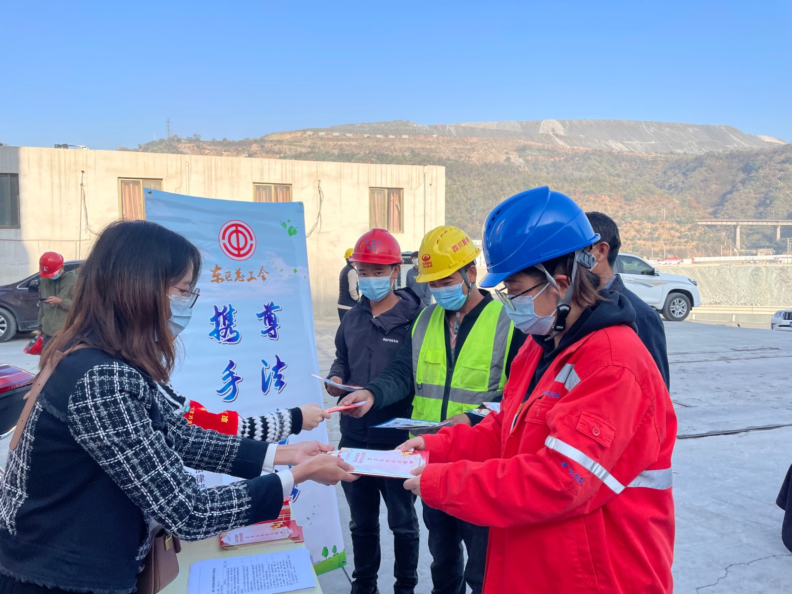 活動現場東區總工會工作人員為一線工友發放了《中華人民共和國工會法》《中華人民共和國憲法》《安全生產和職業健康知識職工普及讀本》及東區總工會印制的《深入學習宣傳習近平法治思想,大力弘揚憲法精神》等相關法律法規宣傳資料,并進行現場咨詢解答疑難提問,從而引導一線職工學習了解法律知識。