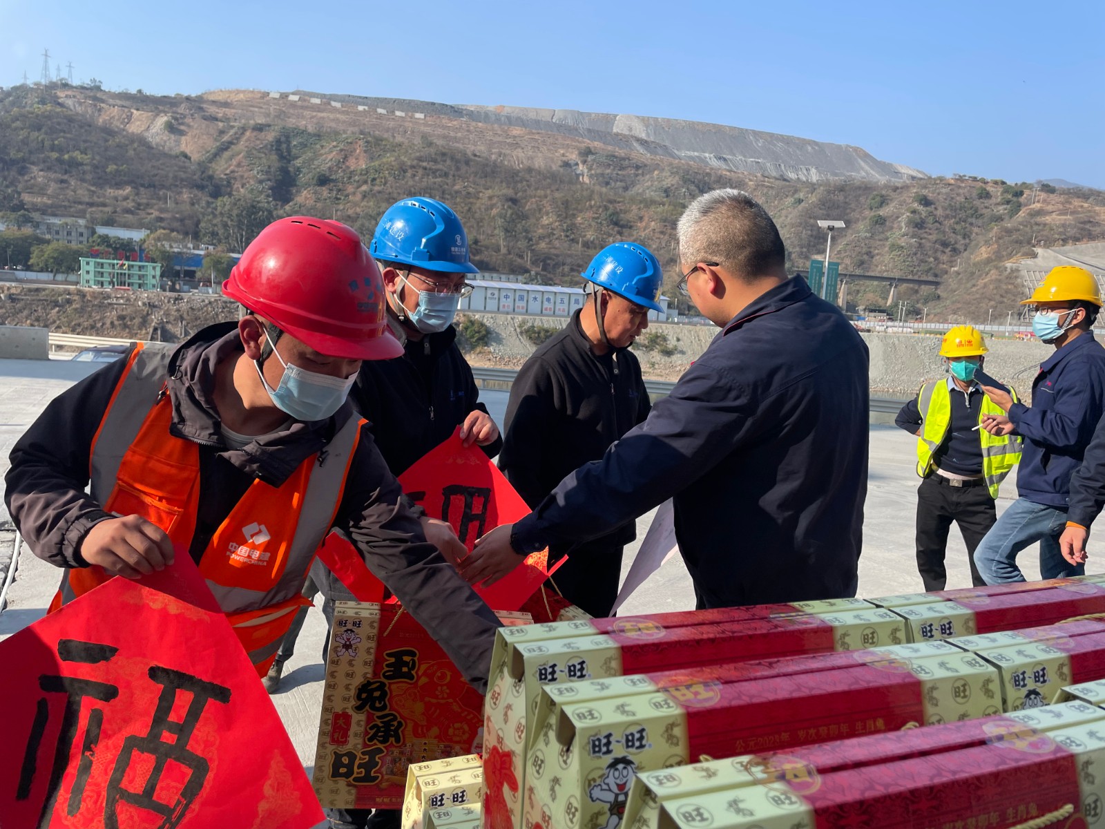 除夕當日,本是疫情放開后闔家團聚的日子,銀江水電站建設工地、郵處光伏發電中心、佳友物業部分職工依然堅守崗位,奮戰在一線。為奮力實現2024年首臺機組發電目標,銀江水電站春節不停工,大壩廠房混凝土澆筑及固結灌漿施工現場依然是一片繁忙,混凝土生產系統、施工變電站等部位也是加強檢修維護和值班值守,郵處光伏中心確保節日期間的正常運行。值班領導鄧勇、周軍、攀水電公司總經理助理嚴瑞平走訪慰問了現場值班人員和各項目營地,為一線值班人員送上了慰問品,對困難職工送上了川投能源工會慰問金,對老黨員、退休黨員、退伍軍人送上了新春慰問。