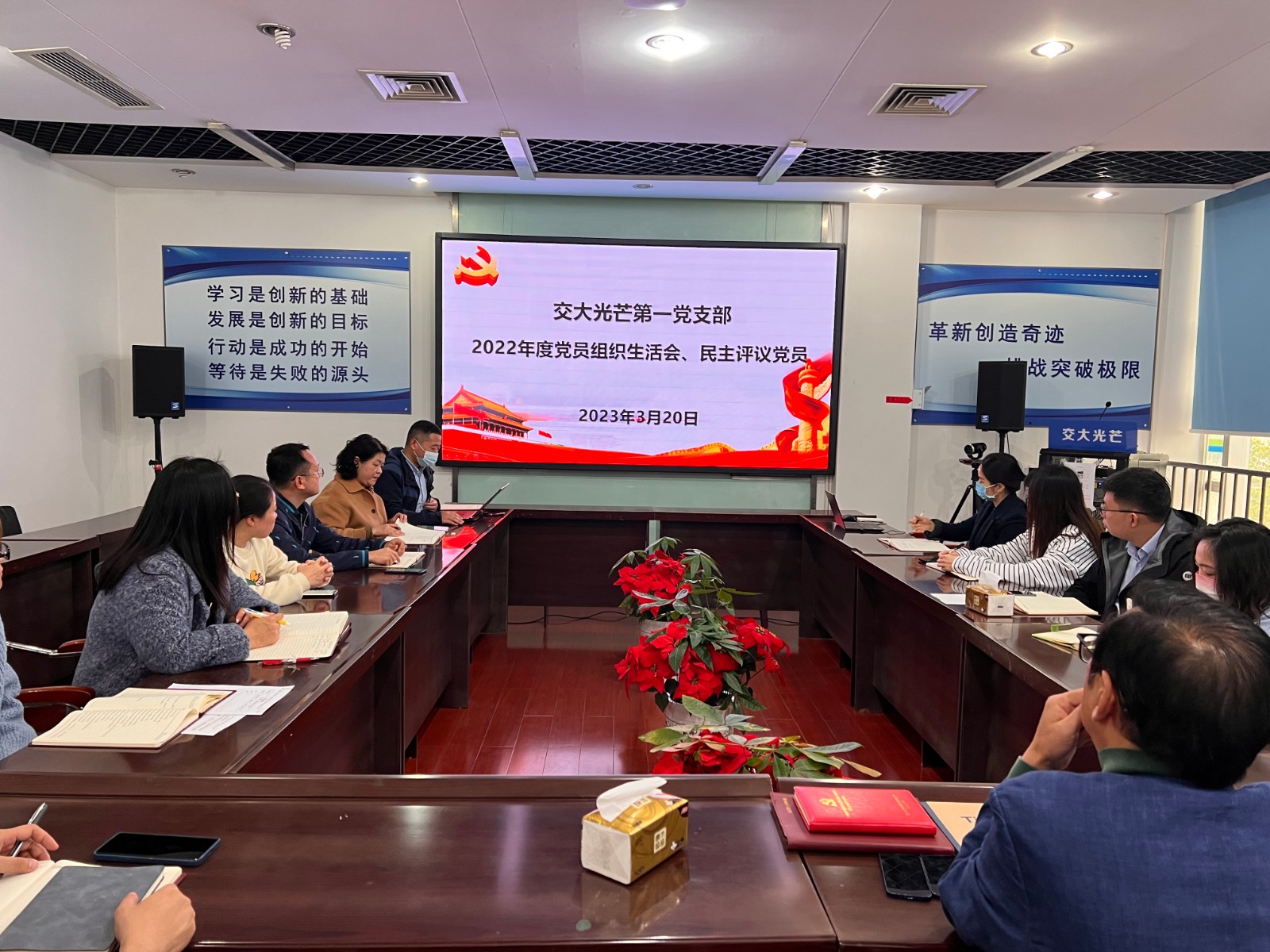 3月20日,按照黨總支工作部署要求,交大光芒第一黨支部召開了2022年度組織生活會并開展民主評議黨員。公司黨總支書記、總經理劉成輝到會督導并點評。第一支部書記、公司副總工程師兼研發中心副總經理王輝博士主持會議。黨總支委員汪志橋按照雙重組織生活要求,以普通黨員身份參加支部組織生活會。
