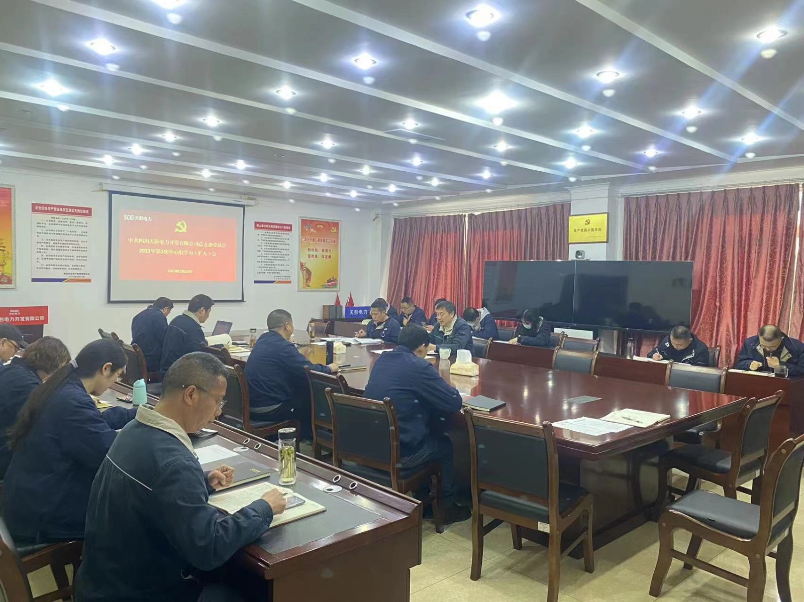 3月22日上午,川投電力黨委所屬天彭電力黨總支召開2023年第3次黨總支理論中心組學習會,專題學習研討全國兩會精神。公司領導、黨員干部、關鍵崗位人員參加會議,會議由公司黨總支書記、總經理劉紅兵主持。