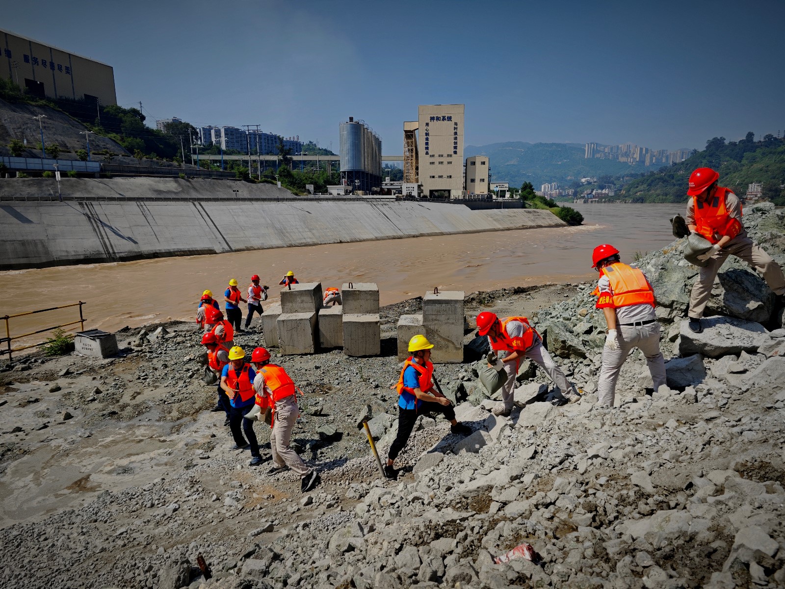 活動中,由公司黨員領導帶頭,分組對導流明渠邊坡、安全體驗館、上下游圍堰及基坑、導流明渠進出口等部位進行了全面詳細的巡視檢查。活動還對防洪度汛應急物資進行了補充,有的拿鐵鍬、有的拿編織袋,通過緊密配合,迅速完成幾百個防汛沙袋的裝袋,并排成長隊接力運送,將沙袋搬運至重點部位整齊堆放。通過半日的緊張勞動,參加人員衣背早已被汗水浸透,但他們沒有絲毫怨言,更是講到這次活動不僅補充了防汛物資,還真正提高了“防大汛、救大災、搶大險”的安全意識和應急搶險能力,將繼續堅守工作崗位,以汛為令、聞汛而動,在防洪度汛和應急搶險中發揮先鋒模范作用,保障銀江水電站工程建設安全順利推進。