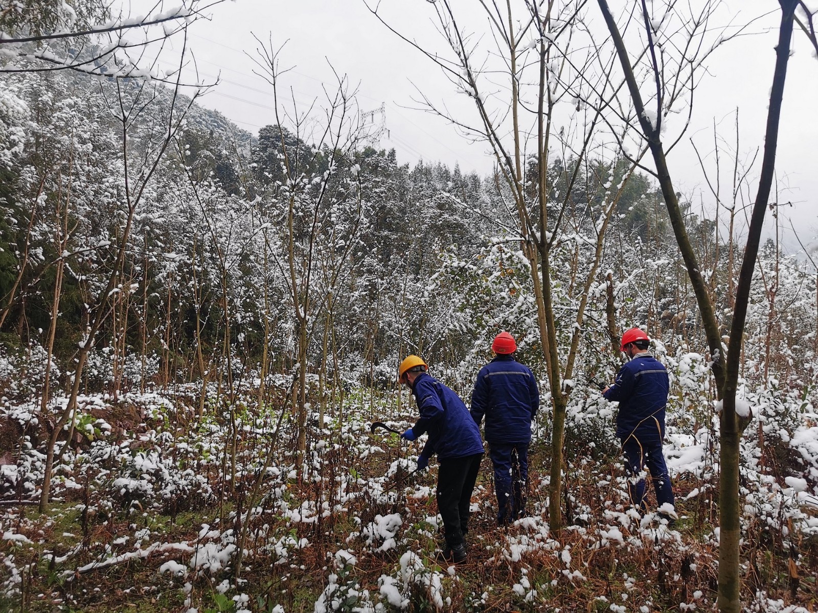1月23日,天彭電力制定詳細的樹障清理計劃。巡線員手持砍刀,翻山越嶺,負重前行,踩著嘎吱作響的積雪,迎著刀割般的寒風,迅速開始對110kV鳳回線、10kV沙橋線、鳳通線等線路設備進行巡查,對倒伏在線路的竹樹進行“圍剿”,共清理樹枝、竹子共110余棵,現場巡線員盡管臉凍得通紅、手凍得僵硬、腳凍得麻木,仍有條不紊地開展工作,經過一天的辛勤巡檢,線路和設備均運行正常。