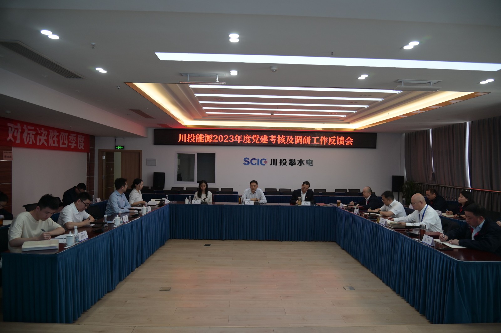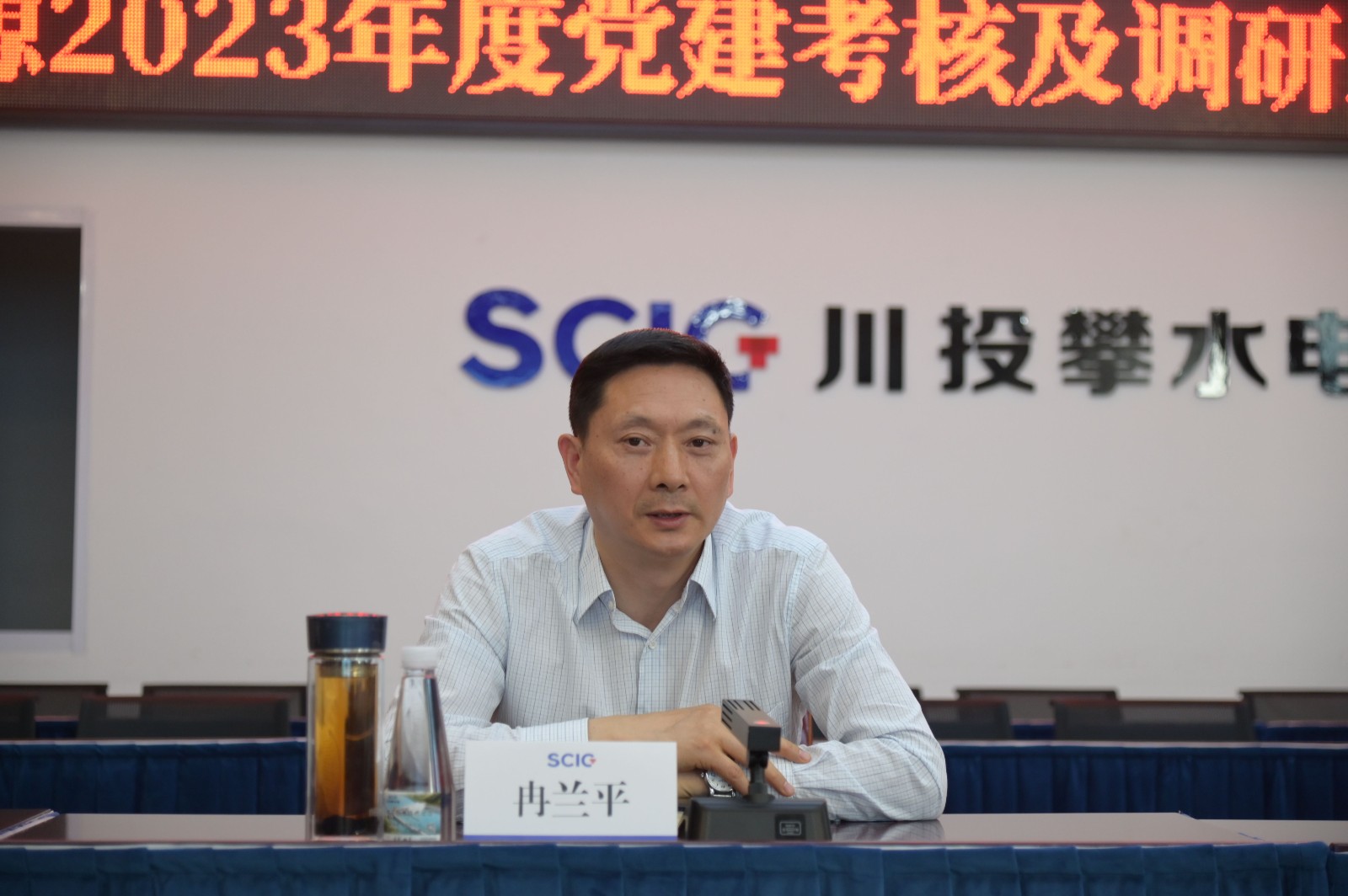攀水電黨總支書記、董事長徐孝剛作表態發言。他表示,攀水電黨總支將全盤認領考核調研組指出的問題和不足,認真梳理、舉一反三,有針對性地制定整改工作方案,全面推動完成整改,堅定不移堅持黨的領導、加強黨的建設,以嚴實舉措狠抓黨建引領企業發展、工程建設,為川投能源高質量發展貢獻銀江力量。