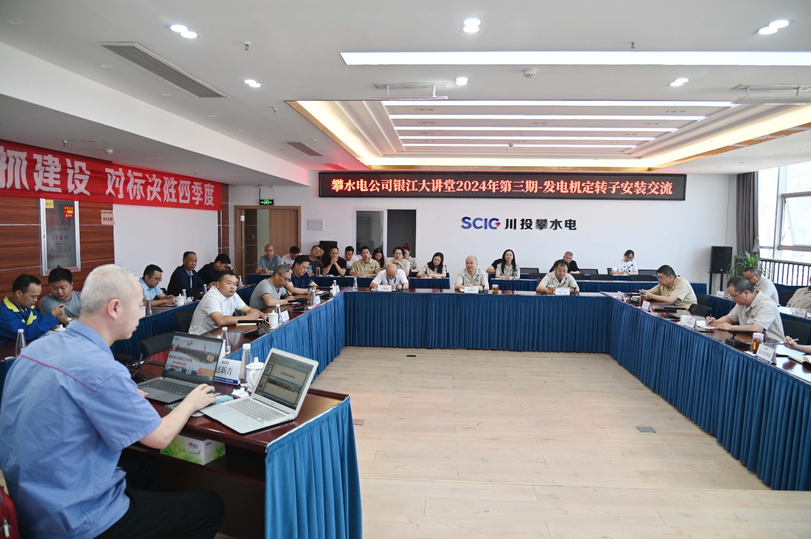 在銀江水電站主廠房橋機順利安裝完成,即將進行水輪發電機組定轉子組裝之際,攀水電公司邀請哈爾濱電機廠有限責任公司高級工程師趙新青,在銀江大講堂上給公司各部門及各參建單位,作了題為《發電機定轉子安裝》的技術交流課,公司領導、各部門及各參建單位相關人員共30余人參加培訓。