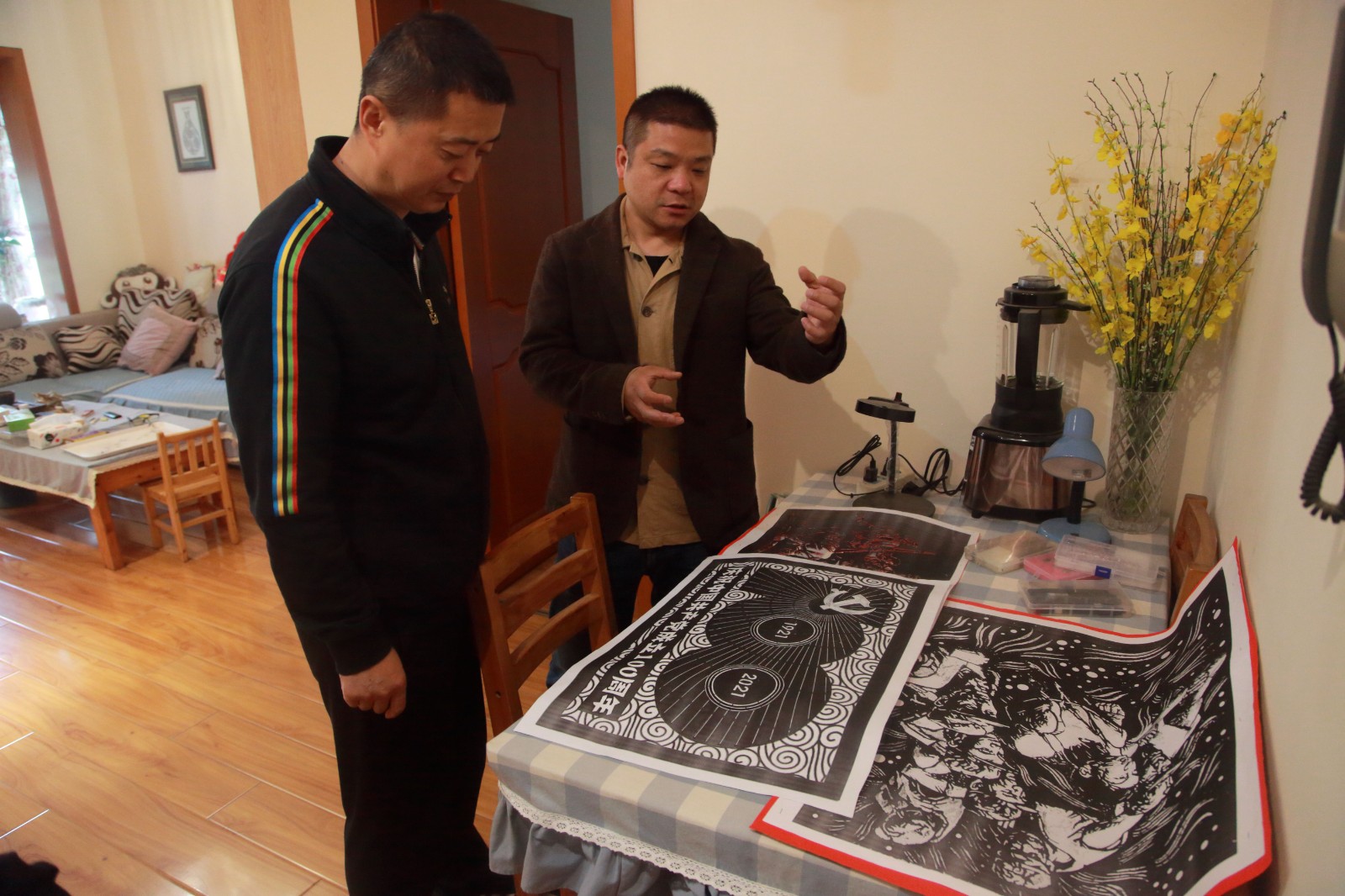 楊超龍詳細詢問了剪紙創作的工期安排、當前進展,共同探討了作品創作構思、整體構圖、內涵要義和各種藝術表現手法的選擇,并參觀了莊叢燦歷年的剪紙作品及創作工具。并向莊叢燦及其團隊指出,要以黨史學習教育為契機,認真梳理、統籌謀劃、精心設計、用心創作好主題作品,通過完整的構架、巧妙的構思、精美的構圖展現黨的百年光輝歷程,歌頌黨的百年豐功偉績。楊超龍鼓勵莊叢燦要在創作中傳承發揚黨的光榮傳統和優良作風,精誠團結、艱苦奮斗、攻堅克難,以剪紙藝術凸顯川投能源的特色和亮點,獻禮建黨100周年。