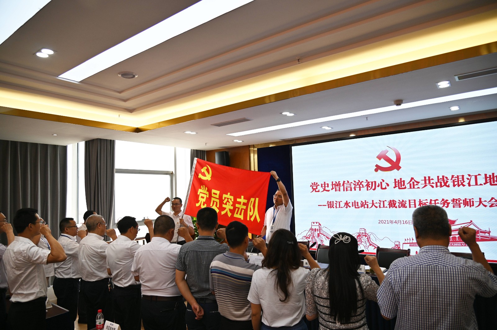 會上,全體參會人員共同學習了市委書記張正紅在市級領導干部和縣級主要負責同志讀書班暨市委理論學習中心組專題學習(擴大)會議上的講話精神;蔡承德宣讀了銀江水電站項目建設黨員突擊隊人員名單;徐孝剛與陳康共同向黨員突擊隊授旗并簽訂目標承諾書;全體突擊隊隊員在隊旗前進行了莊重宣誓。