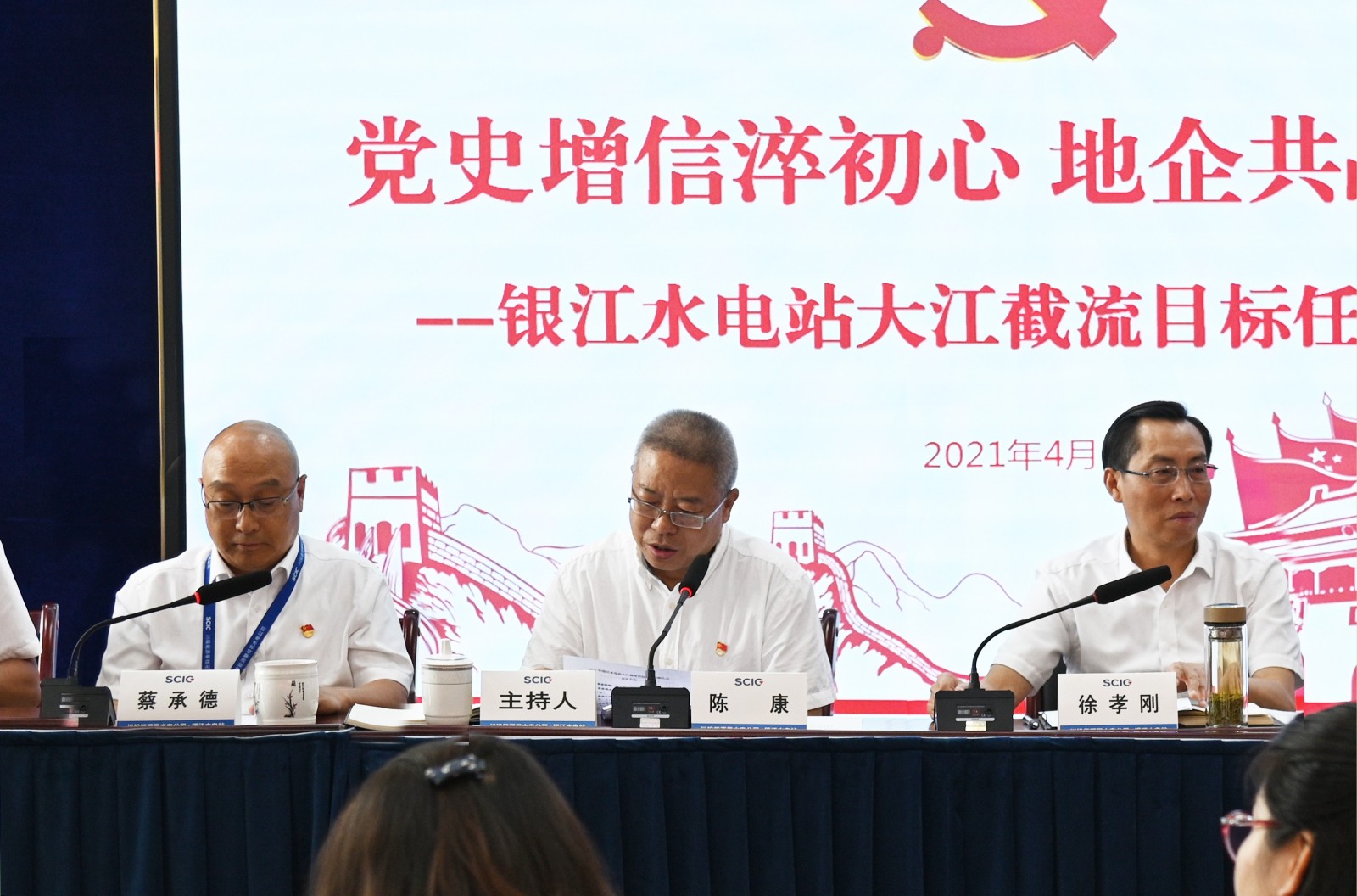 會議由東區區委常委、政法委書記、銀江水電站項目推進領導小組常務副組長陳康主持,川投能源副總經理、攀水電公司黨總支書記、董事長徐孝剛,黨總支副書記、總經理蔡承德,副總經理周軍及公司黨員代表和東區政府相關部門等共計40 余人參會。