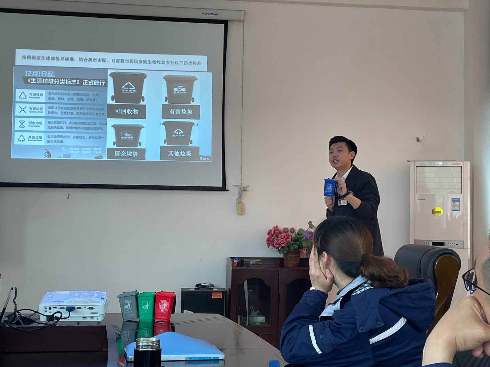 此次職工培訓特邀人人安康公益服務中心宣教科的老師主講,普及了健康環保理論知識和環保法律法規,四川省生活垃圾分類的管理辦法、單位個人如何正確進行垃圾分類以及環境污染與健康飲食飲水知識等相關內容。針對電站員工關于部分生活垃圾如何分類的困惑,老師結合生活實際,給大家一一作了講解。