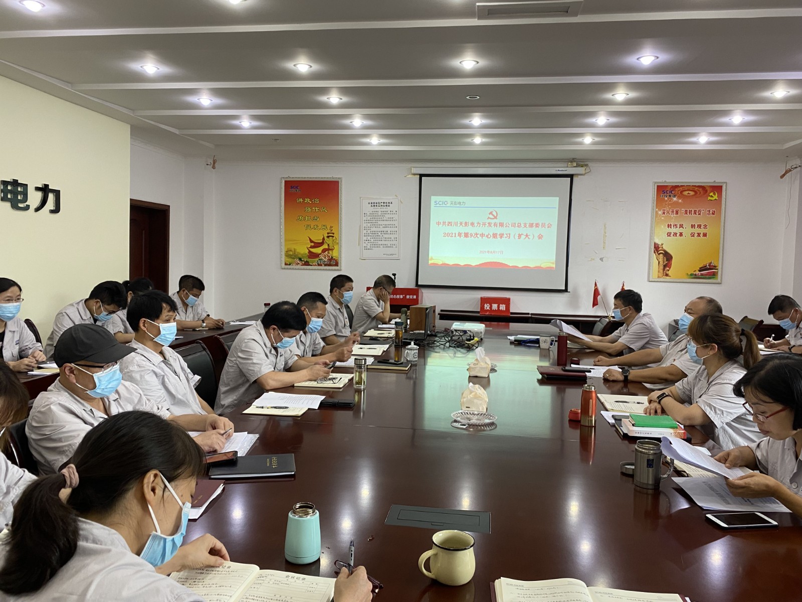 8月17日上午,天彭電力黨總支在公司二樓會議室召開2021年第9次中心組學習(擴大)會,公司領導、黨員干部、關鍵崗位人員參加會議,會議由公司黨總支書記、總經理陳忠主持。